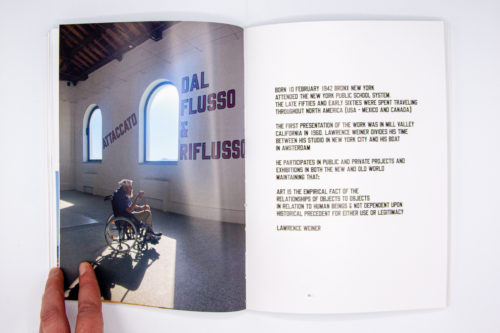 Descriptif plus que prescriptif, le travail de Weiner présente au spectateur un ensemble vaste de possibilités et de significations. ATTACHED BY EBB & FLOW est une installation de Weiner créée pour le Nivola Museum à Orani, Sardaigne, Italie. Le titre fait référence aux marées et à l’expérience d’exil et de relocalisation de l’artiste sarde Costantino Nivola, ainsi qu’à la crise migratoire actuelle en Méditerranée. Les phrases sont traduites de l’anglais vers l’italien vers le sarde local, en utilisant différents mots et constructions et présentées simultanément pour montrer de nombreuses possibilités d’interprétation. Alors que les choses peuvent être perdus dans la traduction, Weiner montre que beaucoup plus peut y être trouvé.