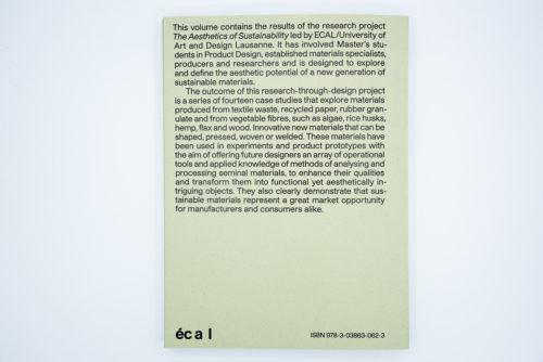 “This volume summarises the results of “The Aesthetics of Sustainability”, a research project conducted by the ECAL/Ecole cantonale d’art de Lausanne. The project brought together master’s students in product design, materials specialists, manufacturers and researchers to explore and define the aesthetic potential of a new generation of sustainable materials. The result is a series of fourteen case studies on the development of materials made from textile waste, recycled paper, rubber granules or plant fibres. The new materials can be shaped, pressed, woven or welded. A selection of these materials will be presented through experiments and product prototypes.”
