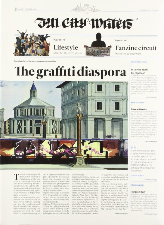 The title, ALL CITY WRITERS, describes a vast research on the Writing movement, focusing particularly on the process of its exportation from New York to all of Europe during the ’80s. The first part of the research analyzes how graffiti in media such as movies, videos, magazines, and books from New York influenced Europe. When images of the New York subway arrived in London, Paris, Munich, and Amsterdam, a huge milestone was set: A first generation of European graffiti writers started to follow the letters, the method, the techniques, and the general lifestyle of New York in the ’70s.