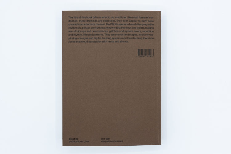 The title of this book tells us what to do: meditate. Like most forms of meditation, these drawings are objectless, they even appear to have been created in an automatic manner. Bart Stolle seems to have fallen prey to the rhythm of a plotter, converting unknown data into line and points, making use of hiccups and coincidences, glitches and system errors, repetition and rhythm, infected patterns. They are mental landscapes, intuitively exploring analogue and digital drawing systems and transforming them into zones that cloud perception with noise and silences