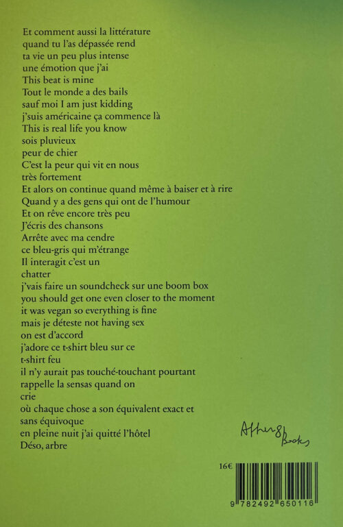 The author describes bodies; bodies in a common space going about different activities. She uses words to capture the images that are created and vanish before our very eyes, as in the practice of drawing live models. She dares to use neologisms, crossing French and English. Rosanna talks explicitly about gender issues, describing sex scenes where the inequality of relationships is questioned. It is also a book of rupture, where love and friendship allow for a reinvention of relationships and form.