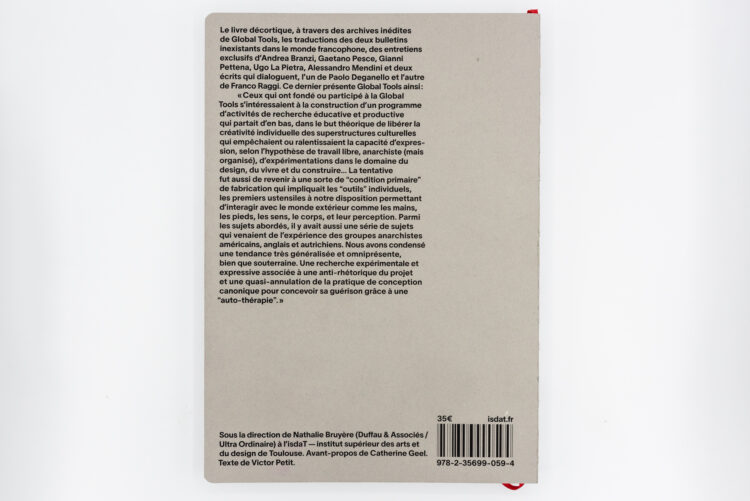 Through unpublished archives, this book analyses in depth the very first French translations of the two Global Tools bulletins, exclusive interviews with Andrea Branzi, Gaetano Pesce, Gianni Pettena, Ugo La Pietra, Alessandro Mendini and two writings in dialogue, one by Paolo Deganello and the other by Franco Raggi.