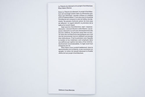 In “The Diamond Theory” the architectural project is considered in its practical as well as theoretical dimension. Critical thinking and creation are inseparable here. The work of the architect is compared to that of the diamond cutter, and the thinking is based on three axes of reflection: the attentive eye, the precision of the cut, and the risky work. Seven works of architecture, seven ‘diamond spaces’, illustrate this theory.