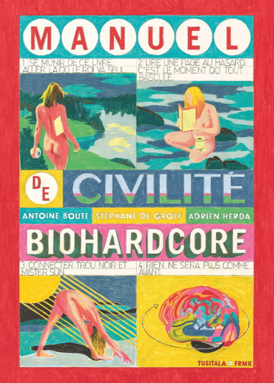 Antoine Boute, Stéphane de Groef et Adrien Herda appréhendent l’avenir avec une confiance aveugle. En témoigne ce Manuel de Civilité Bioharcore qui, dans une explosion de couleurs, de poésie et de typographies, recompose le quotidien avec des conseils pour aborder la vie sereinement en branchant un Kärcher aux égouts pour dégager une piste de pétanque ou encore emmener ses enfants camper dans un « spot bien déglingue » et les réveiller en leur faisant croire qu’ils passent à la télé. Tant de haïkus sordides arrangés à la manière de planches pédagogiques et éducatives, éléments narratifs, injonctions politiques et environnementales se digèrent les uns les autres pour former un ensemble fascinant, d’où se dégagent un malaise et une poésie déconcertants. Cet étrange ouvrage à l’ingéniosité graphique et littéraire ravira un large public composé de révoltés de la société, de poètes en mal de reconnaissance et de fans de bande dessinée indépendante.