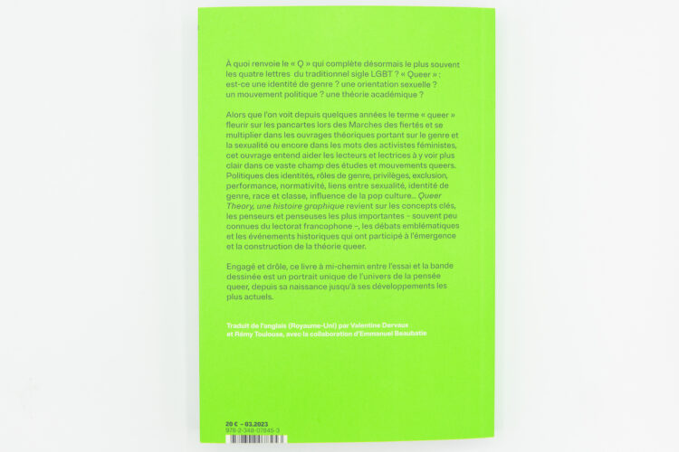 What does the ‘Q’ that now most often complements the traditional four-letter acronym LGBT refer to? “Is it a gender identity, a sexual orientation, a political movement or an academic theory? In recent years, the term “queer” has flourished on the placards of Pride marches and has become more and more common in theoretical works on gender and sexuality or in the words of feminist activists. This book aims to help readers understand this vast field of queer studies and movements. The book explores the politics of identity, gender roles, privilege, exclusion, performance, normativity, the links between sexuality, gender identity, race and class, and the influence of pop culture. Queer Theory, a graphic history looks at the key concepts, the most important thinkers – often little known to the French-speaking readership -, the emblematic debates and the historical events that have contributed to the emergence and construction of queer theory. Engaging and funny, this book, halfway between an essay and a comic book, is a unique portrait of the world of queer thought, from its birth to its most current developments.
