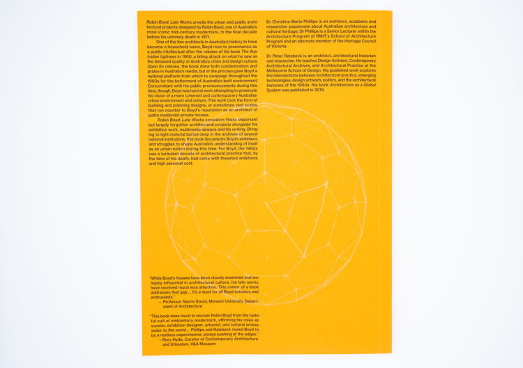 “One of Australia’s most iconic mid-century architects, Robin Boyd (1919–1971) rose to prominence with ‘The Australian Ugliness’ (1960), a biting attack on what he saw as the debased quality of its cities and design culture. ‘Late Works’ unveils the urban public architectural projects designed by Boyd, which were significant in the betterment of Australia’s built environment but have been largely forgotten. This work includes building and planning designs that seem counter to his reputation as an architect of polite modernist private homes. Considered alongside Boyd’s exhibition work, multimedia designs, and writing, it is an insightful window into his ambitions and struggles.”