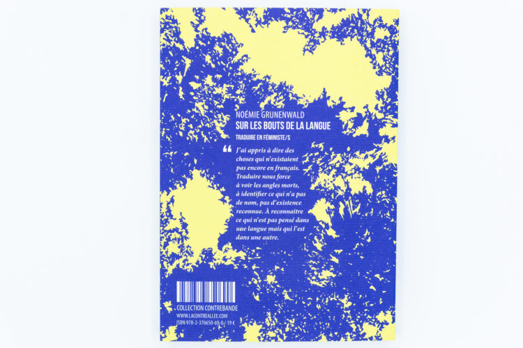 “Noémie Grunenwald constantly seeks to transcribe this feminist commitment in her translations, questioning the forms of writing, the choice of terms, coming up against gaps and absences, and developing new strategies in a political, militant practice of translation. Invoking the authors who have marked her practice, Noémie Grunenwald explores what it means to “translate as a feminist”: to abandon oneself / to improvise / to submit / to decentre / to interpret / to correct / to expand / to include / to learn / to translate / to weave / to quote; all of these are necessary steps in writing a translation. It is with frankness, humility and humour that Noémie Grunenwald punctuates her essay with a more personal account of the path she has taken, from the first articles in fanzines translated, just to understand better, to professional translation. Paying tribute to the people and texts that have marked her training, the author recounts her commitment, passion and determination, and challenges us with a tone that is as direct and forceful as it is catchy. Translating as a feminist is a way of fighting against the established order.”