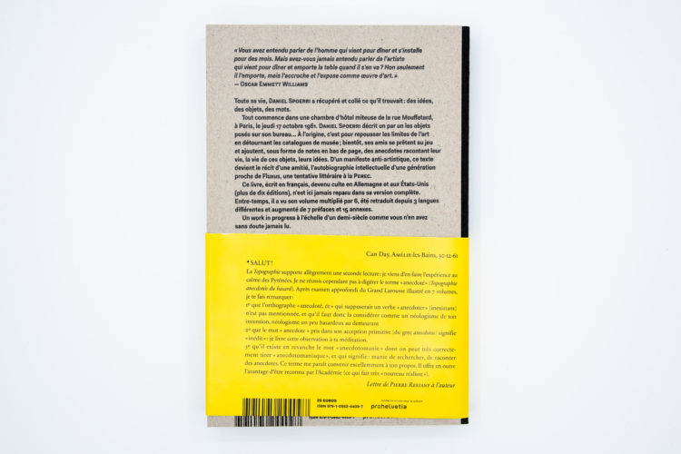 Le 17 octobre 1961, Daniel Spoerri fait l’inventaire des objets composant sa table de travail dans sa chambre d’hôtel de la rue Mouffetard, décrivant chaque objet comme s’il s’agissait d’un catalogue de musée.