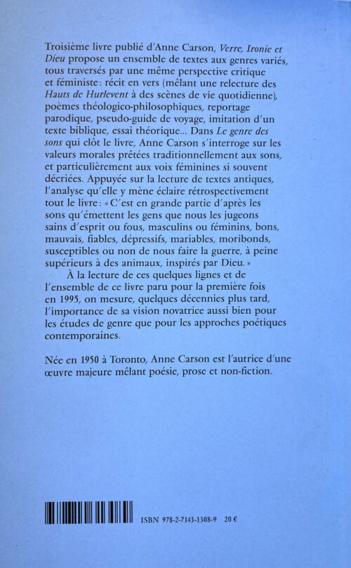 Anne Carson’s third published book, Verre, Ironie et Dieu (Glass, Irony and God) is a collection of texts in a variety of genres, all traversed by the same critical and feminist perspective: verse narrative (mixing a rereading of Wuthering Heights with scenes from everyday life), theological-philosophical poems, parodic reportage, pseudo-journey guide, imitation of a biblical text, theoretical essay… In Le genre des sons, which brings the book to a close, Anne Carson examines the moral values traditionally attributed to sounds, and in particular to the female voice, so often disparaged. Based on a reading of ancient texts, her analysis sheds light on the whole book in retrospect: “It is largely on the basis of the sounds people make that we judge them to be sane or insane, male or female, good, bad, reliable, depressed, marriageable, moribund, likely or not to wage war against us, hardly superior to animals, inspired by God. Reading these few lines and the whole of this book, which was first published in 1995, we can see, a few decades later, the importance of his innovative vision for both gender studies and contemporary poetic approaches.