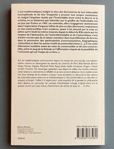 Art and mathematics have always enjoyed an intimate relationship, as illustrated by the works of Leonardo da Vinci, Béla Bartók, Bernar Venet, Roman Opalka, Manfred Mohr, Ryoji Ikeda, Hollis Frampton, Shigeru Onishi and many others. Since the 1960s, however, this relationship has begun to weaken, and a certain distance has appeared between these two spheres of creativity. Tombroff takes us on a journey to discover the reasons for this bifurcation between art and mathematics in the postmodern era and identifies a prime suspect: infinity. For this investigation, he draws on the work of philosopher Alain Badiou, in particular on the concept of inaesthetics, a novel approach that challenges the conventional notion of aesthetics that Badiou introduced to account for the specific yet universal nature of art’s truths.