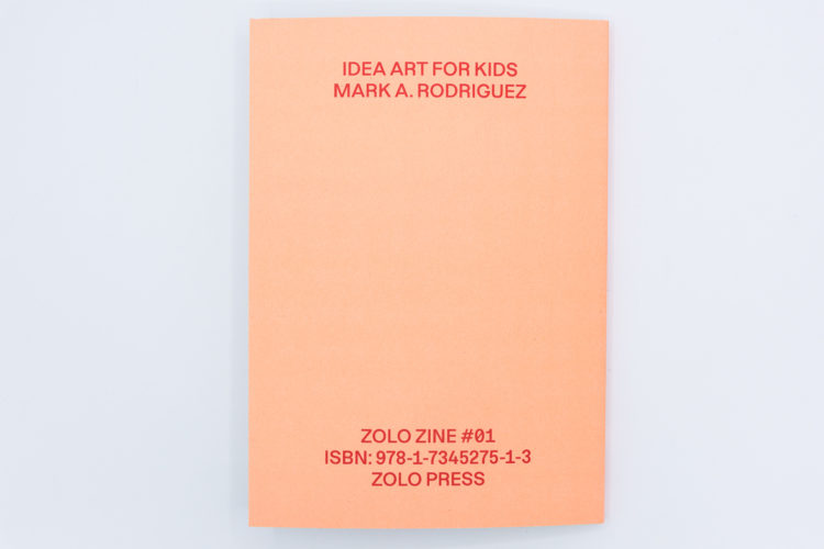Zolo Zine #1: Mark A. Rodriguez wrote and self-published Idea Art for Kids in 2006 while completing his graduate thesis at California College of the Arts. Through lessons both droll and defiant—“Post missing signs for things that really aren’t really missing”; “Teach a non-human how to read”; “Develop a machine to make art for you”— Rodriguez invited children to make contemporary art practices their own. Fourteen years later—and with fourteen new lessons and two original essays by curator Lola Kramer and educator Manny Lopez—Idea Art for Kids is re-issued here for the first time.