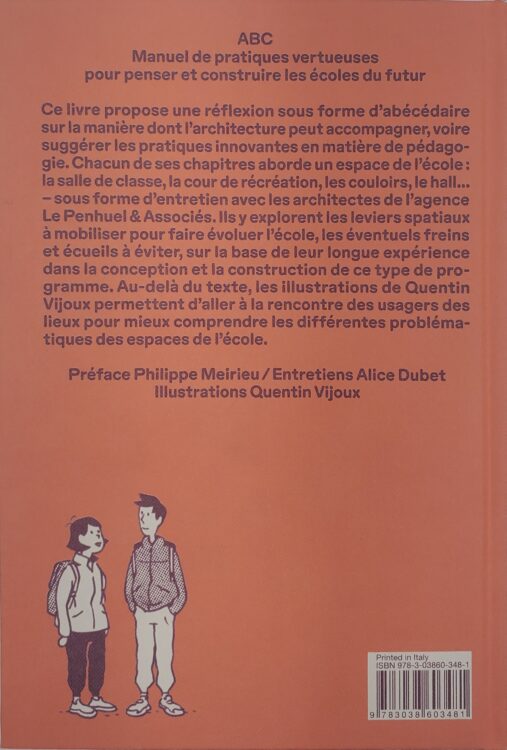 Chacun des dix chapitres de ce livre se concentre sur un élément clé de ces structures, comme la salle de classe, la cour d’école, le couloir, l’auditorium, etc. En conversation avec Alice Dubet, publiciste en architecture, Le Penhuel trace les voies d’une meilleure architecture scolaire et signale les obstacles à surmonter et les erreurs à éviter. Les illustrations de Quentin Vijoux permettent de visualiser facilement les concepts de Le Penhuel & Associés architectes, non seulement pour les architectes et les enseignants, mais aussi pour les élèves et leurs parents.