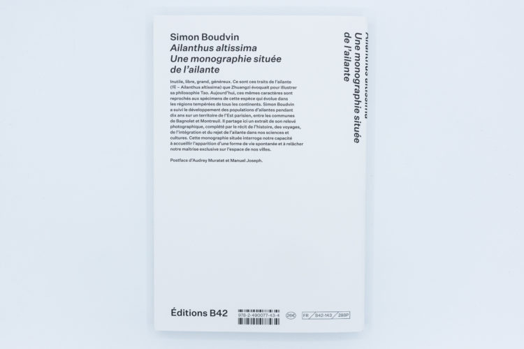 Inutile, libre, grand, généreux. Ce sont ces traits de l’ailante(樗 – Ailanthus altissima) que Zhuangzi évoquait pour illustrer sa philosophie Tao. Aujourd’hui, ces mêmes caractères sont reprochés aux spécimens de cette espèce qui évolue dans les régions tempérées de tous les continents. Simon Boudvin a suivi le développement d’une population d’ailantes pendant dix ans sur un territoire de l’Est parisien, entre les communes de Bagnolet et Montreuil. Il partage ici un extrait de son relevé photographique, complété par le récit de l’histoire, des voyages, de l’intégration et du rejet de l’ailante dans nos sciences et cultures. Cette monographie située interroge notre capacité à accueillir l’apparition d’une forme de vie spontanée et à relâcher notre maîtrise exclusive sur l’espace de nos villes.