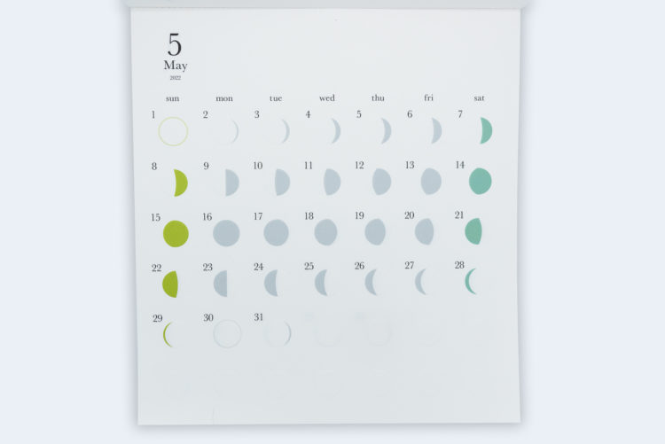Le mot japonais michiru signifie « devenir plein ». Chaque jour du calendrier est un cercle gaufré avec une couleur d’accentuation pour montrer les différentes phases de la lune. Ce graphique subtil vous permettra de rester en phase avec le cycle de la nature et la beauté du temps qui passe. Les phases de la lune des samedis et dimanches sont mises en évidence par des couleurs accentuées et celles des jours de la semaine sont indiquées en gris. Chaque mois présente un design de couleur légèrement différent pour compléter les saisons qui changent constamment.