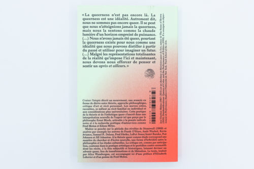 » Cruiser l’utopie est le fruit d’un travail de recherche de plus de dix ans sur les potentialités queer que José Esteban Muñoz observe dans les pratiques artistiques et littéraires des années 1960 et 1970 à New York et Los Angeles, pratiques qui lui permettent d’éclairer le dessin d’un futur bien au-delà de l’hétéronormativité reproductive dominante.