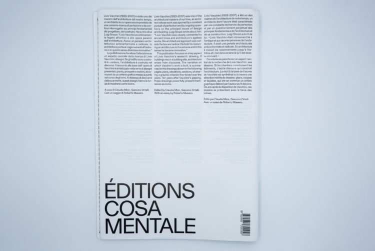 « Ce volume se penche sur un aspect central de la recherche de Livio Vacchini : ses dessins. L’œuvre de l’architecte suisse est synthétisé ici à travers une sélection inédite de dessins – plans, coupes et façades – qui ont en commun un critère graphique élaboré par l’auteur au fil des ans. Dix ans après la disparition de Vacchini, ces dessins se présentent avec la force des icônes.