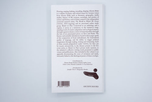 « Couler, suinter, fuir, cascader, façonner. Electric Brine est un volume de poésie et d’essais critiques rédigés par des voix féminines issues de divers domaines tels que la littérature, la géographie, les études des médias, l’histoire des sciences de la vie, la sociologie et la poétique de la science et de la fiction, chacune d’entre elles étant au cœur de l’entité de recherche curatoriale indépendante The World in Which We Occur (TWWWO, 2014-en cours) et de son groupe d’étude en ligne associé Matter in Flux. Conçu comme une anthologie et un registre, il sert de témoignage au travail de longue date de l’initiative en matière d’adaptation créative et d’enquête écologique à travers une quête visant à situer une vision de la politique matérielle à travers le prisme de six pièces ponctuées sur le flux et les fluides. Les fabulations littéraires et scientifiques que l’on trouve dans ces pages parlent de la conjonction de l’incarnation vécue, de la qualité matérialisée du langage et de la capacité à déclencher l’imagination politique par la lecture, l’écriture et le témoignage. Chacune de ces pistes se retrouve dans TWWWO, car elles peuvent être retracées, rétroactivement, aux thèmes présents dans la série d’événements en direct, aux sessions d’étude privées de Matter in Flux, aux travaux d’écriture collective de l’initiative présentés dans des lieux publics et des publications. Ce volume comprend également une annexe qui documente les années d’invitation et d’étude, intimement liées à la praxis idéologique de ces chevauchements. »