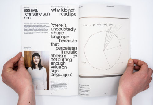 « Esperanto se lance, dans un monde aux interconnexions complexes, rassemblant des intellectuels et des créateurs de premier plan pour parler de la culture du XXIe siècle. Il rassemble différentes perspectives dans une revue complexe, diverse et pourtant unifiée. Sous la direction artistique du studio de design Experimental Jetset basé à Amsterdam et avec les conseils éditoriaux de Hans Ulrich Obrist, chaque numéro propose des critiques, des sources, des essais et un dossier spécial. Ce premier numéro explore le concept de « Whole Earth Government », une façon de gérer la citoyenneté transnationale et la démocratie dans notre monde global. Le musicien Ryuichi Sakamoto, Experimental Jetset et l’artiste sonore coréenne Christine Sun Kim, basée à Berlin, y contribuent tous. » Idea Books