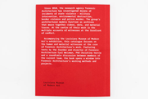 Ce catalogue met l’accent sur les témoins qui sont au cœur du travail de Forensic Architecture. Comme l’explique Weizman : « Très souvent, parce que « forensic » fait partie de notre nom, il y a un certain malentendu, comme si le travail de preuve que nous faisons … constituait une alternative, et parfois même un substitut, à la voix humaine du témoin. Je crois plutôt que notre travail maintient la relation entre la preuve et le témoignage dans un état de tension productive ». Comprenant des textes de Weizman et de Christina Varvia, ainsi qu’une table ronde entre les membres de l’équipe actuelle, ce livre richement illustré ouvre une fenêtre sur les méthodes de travail et les projets de Forensic Architecture.
