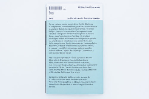La Fabrique de Fanette Mellier, premier ouvrage de la collection Prisme, réunit des entretiens menés par Alexandre Dimos (graphiste et éditeur), Francine Foulquier (commissaire d’exposition) et Victor Guégan (historien de l’art). »