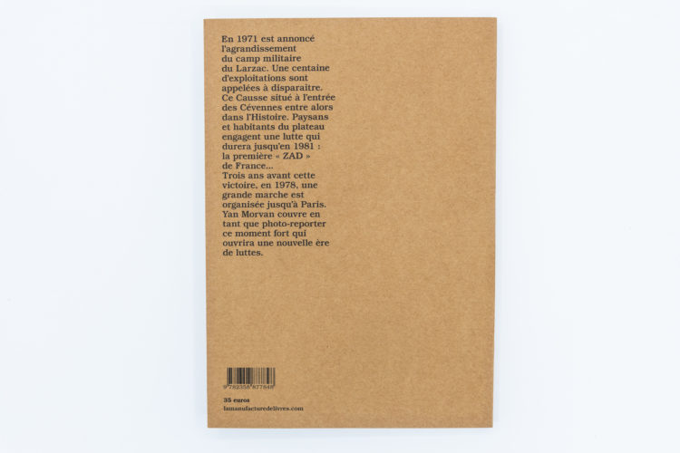 Le Larzac obtint gain de cause dix ans après le début de l’occupation. Trois ans avant cette victoire, en 1978, une grande marche est organisée jusqu’à Paris, moment fort de la lutte qui gagna alors le soutien officiel de François Mitterand. Yan Morvan couvrit en tant que photo-reporter ces dernières années du combat. C’est de ce moment de l’Histoire que témoignent ces photographies. »