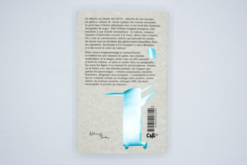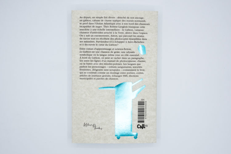 « Au départ, un simple fait divers : un gabion, détaché de son ancrage, une cabane de chasse typique des marais normands, se perd dans l’Océan Atlantique avec à son bord des chasseurs incapables de nager. Théo Robine-Langlois transpose cette anecdote à une échelle interstellaire : le Gabion, vaisseau chasseur d’astéroïdes arraché à la Terre, dérive dans l’espace. On y suit un extraterrestre, Anton, qui parcourt les strates du navire tout en récoltant des photocopies éparpillées dans ses méandres. Parviendra-t-il à échapper à Astro-Richelieu et à découvrir le cœur du Gabion ? Entre roman d’apprentissage et science-fiction, Le Gabion est une chanson de geste, une odyssée symbolique où la langue même joue un rôle essentiel. À bord du Gabion, on peut se cacher dans un paragraphe, lire entre les lignes d’un manuel de photocopieuse, chanter, ou se battre avec des missiles-poèmes. Les langues que parlent les personnages – enfants sanguinaires, sororités féministes, dirigeants sans scrupules – contaminent le livre, qui se construit comme un montage entre poésies, contes, articles de journaux gratuits, paroles de chanson, échanges SMS et élections municipales. »