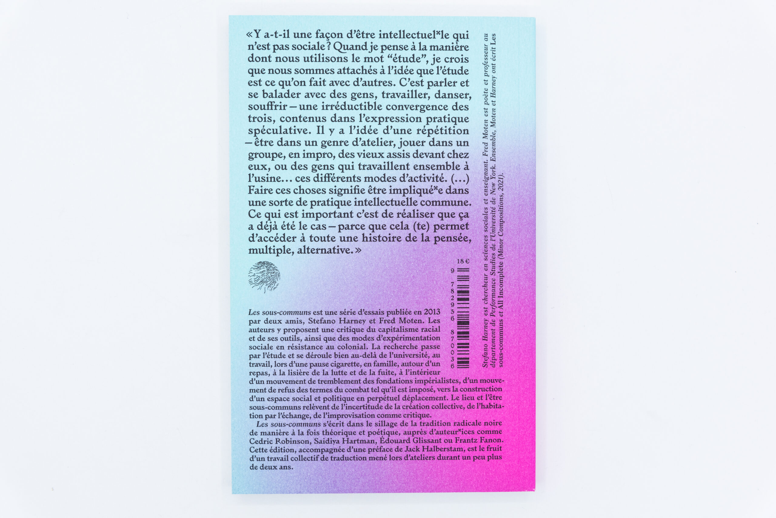 Les sous-communs s’écrit dans le sillage de la tradition radicale noire de manière à la fois théorique et poétique, auprès d’auteurices comme Cedric Robinson, Saidiya Hartman, Édouard Glissant ou Frantz Fanon. Cette édition, accompagnée d’une préface de Jack Halberstam, est le fruit d’un travail collectif de traduction mené lors d’ateliers durant un peu plus de deux ans.