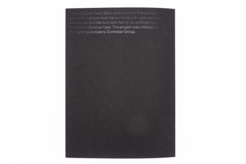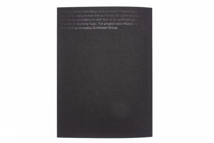 À l’initiative de la société d’éclairage Zumtobel Group, le photographe d’architecture Iwan Baan et l’architecte Francis Kéré ont entrepris de saisir comment le cycle de lumière naturelle du soleil façonne l’architecture vernaculaire au Burkina Faso. Les photos d’Iwan Baan sont accompagnées de croquis d’architecture de Francis Kéré, qui a grandi dans cet environnement lumineux et dont l’architecture s’en inspire. Les superbes photographies sont imprimées selon une technique spéciale qui donne l’impression d’être immergé dans les conditions de lumière qui sont documentées.