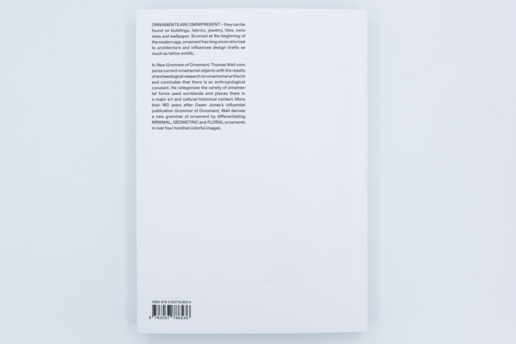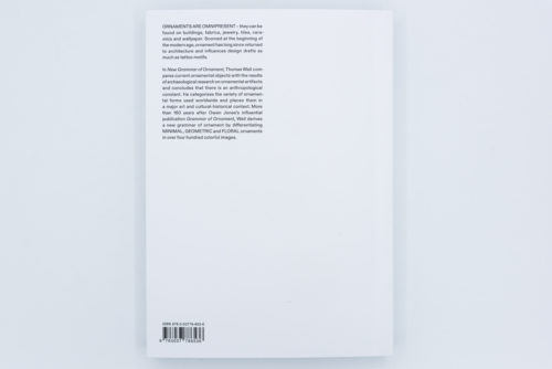 Les ornements sont omniprésents : on les trouve sur les bâtiments, les tissus, les bijoux, les carreaux, les céramiques et les papiers peints. Méprisé au début de l’ère moderne, l’ornement est depuis longtemps revenu dans l’architecture et influence les projets de design autant que les motifs de tatouage. Dans New Grammar of Ornament, l’architecte et designer allemand Thomas Weil compare les objets ornementaux actuels aux résultats des recherches archéologiques sur les artefacts ornementaux, et conclut à l’existence d’une constante anthropologique. À partir des arrangements récurrents de rayures, de rectangles, de triangles et de points et de la fréquence des formes d’ornements floraux utilisés, il déduit une nouvelle « grammaire de l’ornement ». Plus de 160 ans après la publication de ce nom par Owen Jones, New Grammar of Ornament est un nouvel ouvrage de référence. Il catégorise la variété des formes ornementales utilisées dans le monde entier et les place dans un contexte artistique et culturel-historique majeur. »