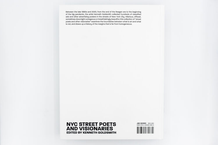 Une histoire secrète de New York racontée à travers des petites annonces et des affiches publicitaires récupérées dans les rues de la ville. Entre la fin des années 1980 et 2020, de la fin de l’ère Reagan au début de Covid, l’artiste et auteur new-yorkais Kenneth Goldsmith a collecté des centaines de petites annonces et autres affiches publicitaires dans les rues de la ville. Hilarantes, décalées, absurdes et parfois d’une beauté à couper le souffle, ces annonces se rejoignent par leur imprévisibilité et leur absence totale d’utilité. Qu’elles aient ou non puisé intentionnellement dans l’esthétique de l’art brut, du cubisme ou de la poésie concrète, elles s’alignent en tout cas sur la thèse de base de la modernité artistique : prendre un objet et le détourner de toute finalité pratique. Au fil des 500 pages de ce volume, Goldsmith retrace près de 40 ans d’histoire américaine racontée depuis les marges, à travers sa collection personnelle d’objets fabriqués par des « poètes de rue et autres visionnaires ». À travers des introductions détaillées à chaque chapitre, Goldsmith réfléchit aux frontières entre l’art et la publicité, ainsi qu’à la notion d’artistes initiés et d’artistes marginaux.