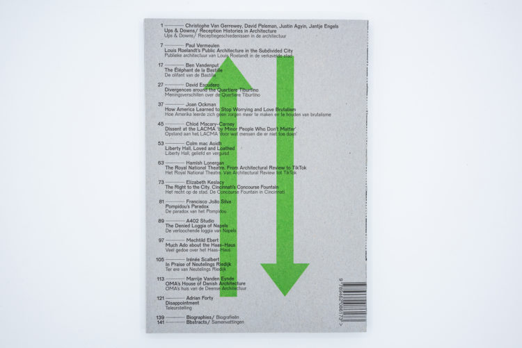 « L’histoire de l’architecture ne se lit pas seulement comme une accumulation de bâtiments et de projets, mais aussi comme un mouvement de balancier entre l’appréciation et le rejet de projets, d’œuvres et de positions, motivé par des arguments divers. Outre les publications générales classiques, les comptes rendus dans les revues professionnelles et les critiques dans les magazines, d’autres médias jouent un rôle croissant. Les œuvres et les projets sont soumis à des tendances, à des vagues d’appréciation de la part du public et des critiques. Ce numéro d’OASE se penche sur la manière dont les changements d’appréciation peuvent agir comme des malentendus productifs et comme des leviers permettant à la critique d’architecture de faire un pas en avant. »