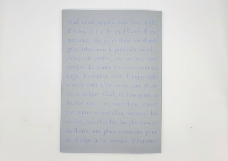 OLAF est un livre entièrement centré sur un personnage. Mis à part son nom, nous ne savons rien de lui. Olaf s’est établi sur les marches d’un escalier étroit, au bord du Rhône, dans la ville d’Arles. Le photographe, Pierre Toussaint, acroisé sa route sur le pont en béton qui relie les deux rives du fleuve. Il s’est approché, puis il a décidé de revenir, et de passer du temps, de s’engager auplus près de son sujet. Il ne l’a plus quitté durant trois semaines.