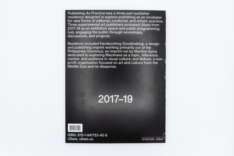 Pendant deux ans, trois éditeurs ont fait d’Ulises un espace d’exposition et un centre de programmation publique, faisant participer le public à des ateliers, des discussions et des projets. Parmi les résidents figuraient Hardworking Goodlooking, la branche éditoriale de la plateforme de pratique sociale The Office of Culture and Design, basée aux Philippines ; Dominica, une maison d’édition dirigée par Martine Syms, qui se consacre à l’exploration de la négritude en tant que sujet, référence, marqueur et public dans la culture visuelle ; et Bidoun, une organisation à but non lucratif axée sur l’art et la culture du Moyen-Orient et de ses diasporas.