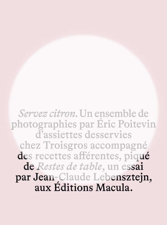 Servez citron. Un ensemble de photographies par Éric Poitevin d’assiettes desservies chez Troisgros, accompagné des recettes afférentes, piqué de Restes de table, un essai par Jean-Claude Lebensztejn, aux Éditions Macula.