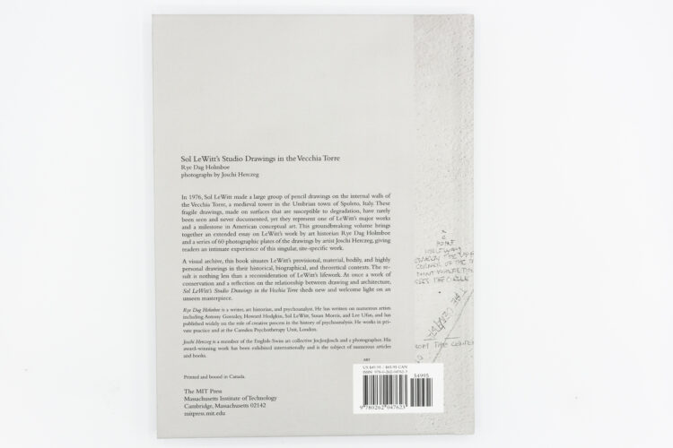 En 1976, Sol LeWitt a réalisé un grand groupe de dessins au crayon sur les murs intérieurs de la Vecchia Torre, une tour médiévale située dans la ville ombrienne de Spoleto, en Italie. Ces dessins fragiles, réalisés sur des murs susceptibles de se dégrader, ont rarement été vus et n’ont jamais été documentés, alors qu’ils représentent l’une des œuvres majeures de LeWitt et un jalon dans l’art conceptuel américain. Ce volume novateur réunit un essai approfondi sur l’œuvre de LeWitt par l’historien de l’art Rye Dag Holmboe et une série de 60 plaques photographiques des dessins par l’artiste Joschi Herczeg, offrant aux lecteurs une expérience intime de cette œuvre singulière et spécifique à un site. En tant qu’archive visuelle, ce livre situe les dessins provisoires, matériels, corporels et très personnels de LeWitt dans leurs contextes historiques, biographiques et théoriques. Le résultat n’est rien de moins qu’une reconsidération de l’œuvre de LeWitt. À la fois œuvre de conservation et réflexion sur la relation entre dessin et architecture, Studio Drawings in the Vecchia Torre de Sol LeWitt jette un éclairage nouveau et bienvenu sur un chef-d’œuvre inédit.