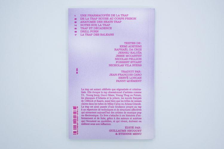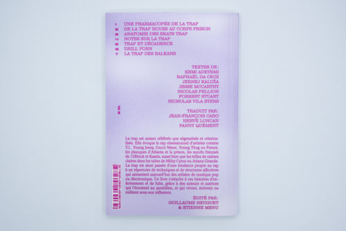 « La trap est autant célébrée que stigmatisée et criminalisée. Elle évoque le rap obsessionnel d’artistes comme T.I., Young Jeezy, Gucci Mane, Young Thug ou Future, les planques d’Atlanta et la prison, aussi bien que les trilles de caisses claires devenues incontournables dans les tubes de Miley Cyrus ou Ariana Grande. La trap est ainsi passée d’une tendance propre aux scènes rap à un répertoire de techniques et d’affects qui aimantent aujourd’hui des artistes de musique pop ou électronique du monde entier. Ce recueil a été élaboré en allant chercher les personnes qui avaient déjà écrit sur ce genre musical, cette sensibilité, ces scènes tels qu’ils s’étaient cristallisés dans le rap depuis le début des années 2000. Si elle ne suit pour l’heure que certaines de ses manifestations entre les Etats-Unis et l’Europe – laissant de côté nombre de voix et de pays, y compris le nôtre – elle rassemble des essais critiques qui enrichissent notre expérience d’amateurs de rap en s’intéressant à ses conditions d’émergence et de circulation, aux vies incarnées ou mises en scènes dans ses productions, ou au quotidien des artistes. »