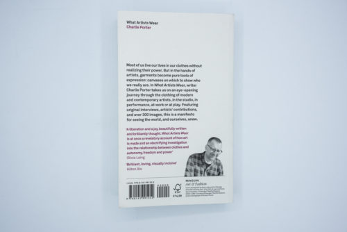 « Dans What Artists Wear, le grand Charlie Porter nous emmène dans un voyage vivifiant et révélateur à travers les tenues emblématiques portées par les artistes, en studio, sur scène, au travail, à la maison et au jeu. Du costume impeccable d’Yves Klein aux tailleurs kaléidoscopiques de Yayoi Kusama et Cindy Sherman ; du denim signature d’Andy Warhol aux vêtements décontractés de Charlotte Prodger, Porter scrute les détails magiques et révélateurs des vêtements qu’il rencontre.